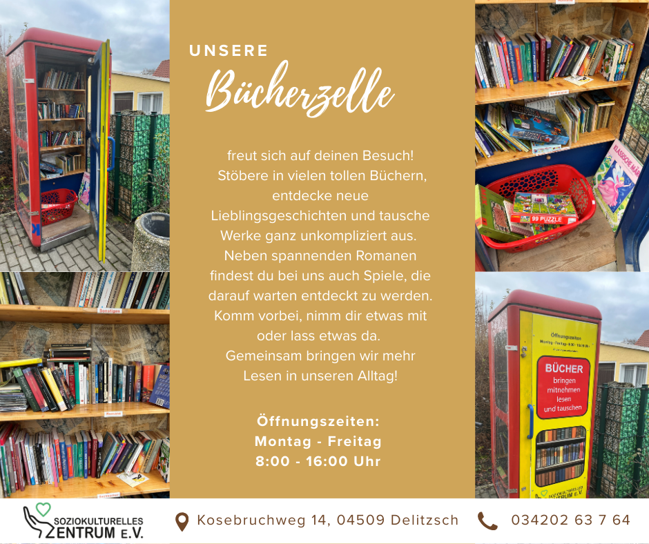 Unsere Bücherzelle ist ein öffentlich zugänglicher Ort, an dem Menschen kostenlos Bücher und / oder Gesellschaftsspiele tauschen können. Die Telefonzelle ist wochentags von 8 bis 16 Uhr zugänglich. Jeder darf Bücher & Gesellschaftsspiele hineinstellen, die er nicht mehr braucht, und sich im Gegenzug andere Bücher oder Gesellschaftsspiele mitnehmen.